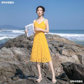 三亚海边拍照衣服黄色连衣裙超大裙摆拖地飘逸沙滩裙度...