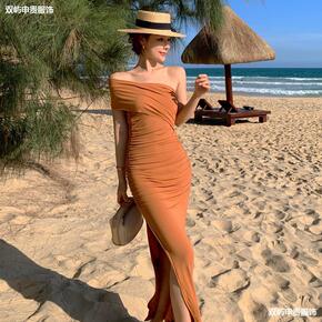 斜肩设计感小众炸街抹胸连衣裙三亚旅行穿搭沙滩裙女海...