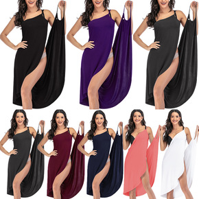 2021年亚马逊欧美新款女装拼接纯色性感沙滩裙 吊...