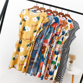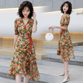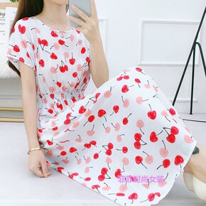 短袖碎花棉绸连衣裙女大码显瘦人造棉大摆裙时尚外穿中...