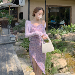夏季吊带碎花裙套装裙两件套今年流行紫色连衣裙海边度...