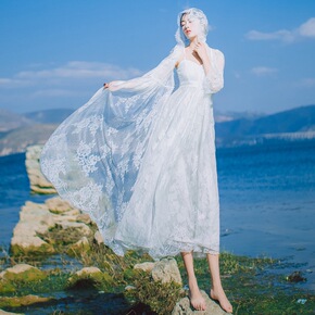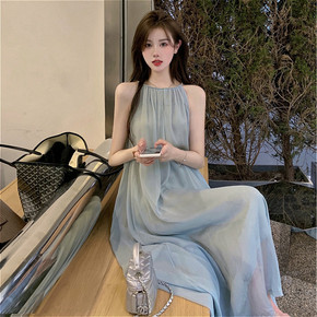 法式别致高级感沙滩海边度假纯欲长裙奶蓝色纱裙仙女连...