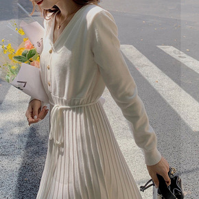 搭配西装大衣外套长袖连衣裙秋冬季赫本风系带V领内搭...