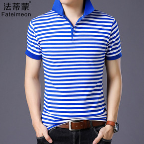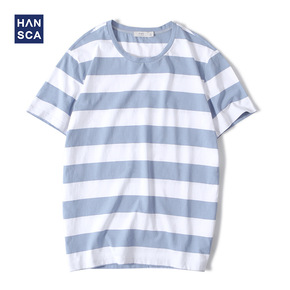 汉斯卡 蓝白条纹短袖t恤男海魂衫宽松韩版潮流纯棉半...