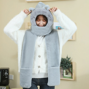秋冬新款韩版帽子围巾手套一体可爱保暖加厚仿兔毛围脖...