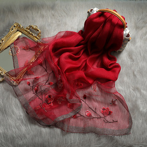 跑量直播带货款真丝羊毛绣花围巾 刺绣丝毛丝巾混纺仿...