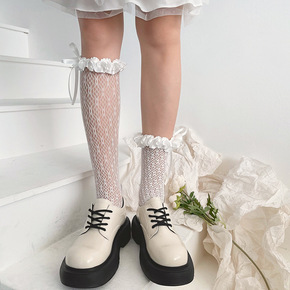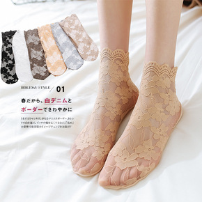 春夏新品袜子批发日系复古镂空网眼蕾丝花朵棉底堆堆袜...