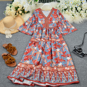 澳洲风情女人味印花喇叭袖连衣裙 度假风很仙的法式长...