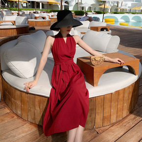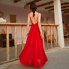 马尔代夫沙滩裙雪纺吊带红色露背连衣裙女夏长款性感显...