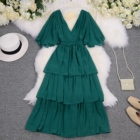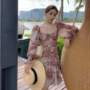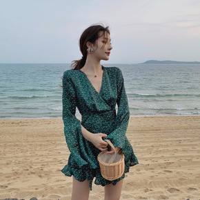 2022新款海边度假旅拍连衣裙夏季复古法式裹胸仙女...
