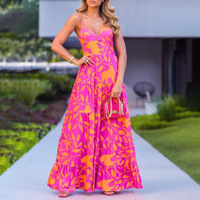 海边度假吊带大摆裙2022春夏新款抹胸高腰长款印花...