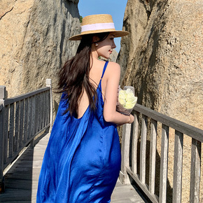 三亚沙滩裙女夏吊带性感露背显瘦海边度假蓝色超仙长款...