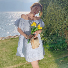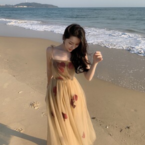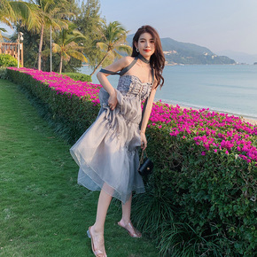 超仙海边旅游穿搭度假裙一字肩吊带连衣裙网纱蓬蓬裙沙...