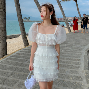 仙女白色网纱露背三亚海边度假沙滩裙旅游沙漠吊带蛋糕...