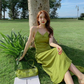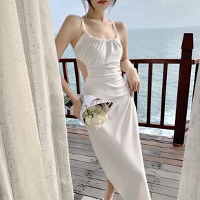气质女神的新衣推荐海边度假露背高腰显瘦纯色吊带连衣...