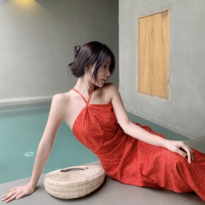 2022Roll红色连衣裙女人味性感露背挂脖小众设...