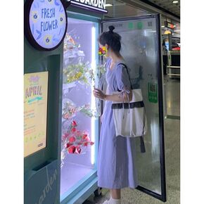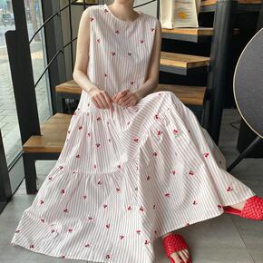 韩国chic仙气温柔条纹小花朵圆领后背系带宽松大摆...