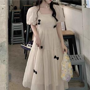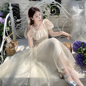 实拍2022夏新款法式温柔方领泡泡袖纱裙超仙女露腰...