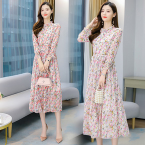 油画连衣裙女茶歇裙夏2022新款收腰雪纺甜美碎花超...