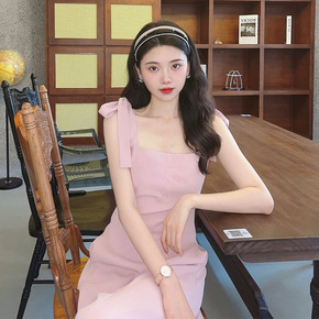 度假仙女裙赫本风方领露背连衣裙夏季结设计感法式温柔...
