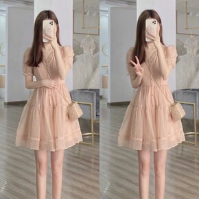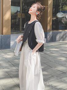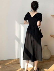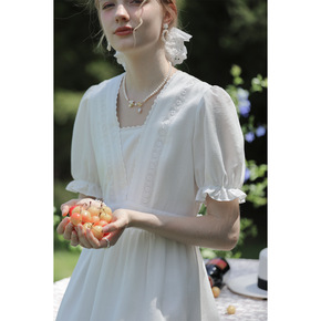 高级感优雅温柔方领露锁骨明线设计收腰显瘦泡泡袖连衣...