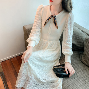 蕾丝连衣裙秋季镂空收腰裙子气质高端名媛内搭打底裙...