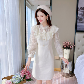 新款秋季甜美蕾丝荷叶领减龄重工小香风连衣裙百搭打底...
