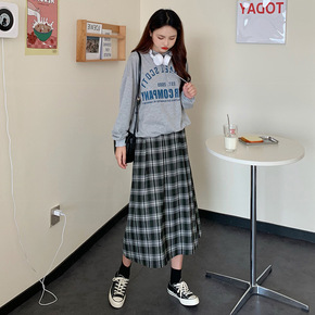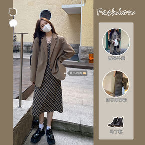 法式中长款连衣裙女春秋装2022年新款时尚百褶格子...