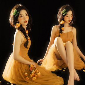 影楼个人写真服装女时尚复古港风吊带连衣裙私房艺术照...