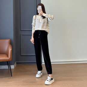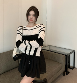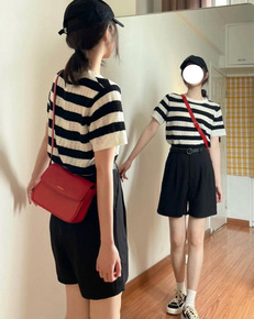 NN申瞅~港风套装女复古chic减龄喇叭袖条纹针织...