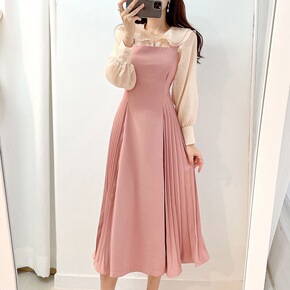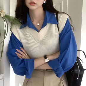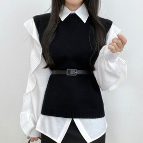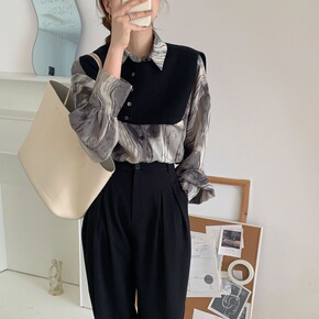 韩国chic秋季复古翻领拼接风琴褶长袖衬衫+针织背...