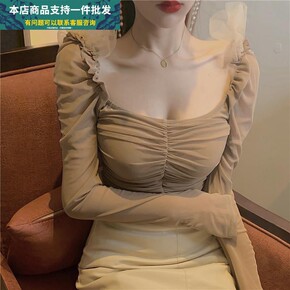韩国chic早秋法式气质轻柔风圆领泡泡袖上衣多色宽...