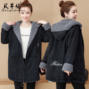 加绒牛仔外套女宽松中长款加厚牛仔大衣棉外套女潮秋冬...