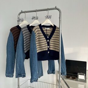 2022早秋新款韩版洋气百搭V领条纹针织开衫拼接泡...