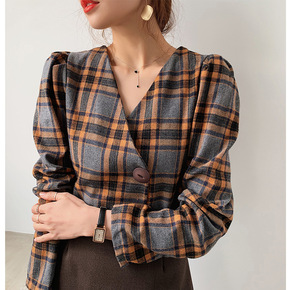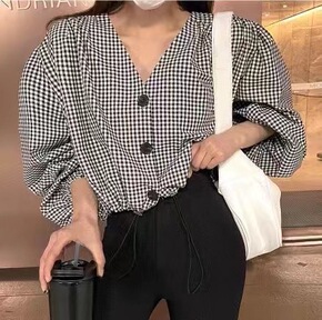 欧洲站格子V领短袖衬衫女设计感小众港风复古时尚宽松...