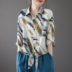 文艺复古港味棉质衬衫女夏清凉薄款大码宽松休闲立领五...