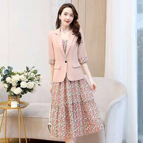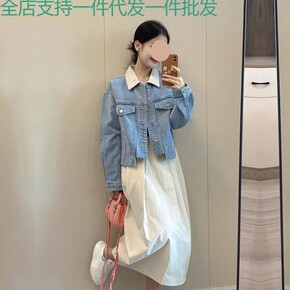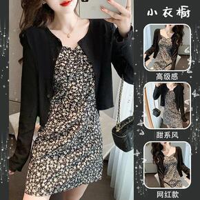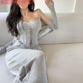 拼色设计感褶皱吊带连衣裙短款长袖开衫女早秋2022...