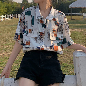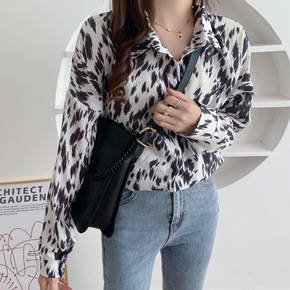 秋新款港风复古豹纹印花长袖衬衫女设计感小众衬衣po...