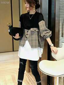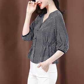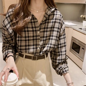 2021夏韩版复古港味格子衬衫女宽松bf慵懒风学生...