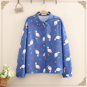2021春季新款学生少女童趣鸭子印花长袖衬衫女士港...