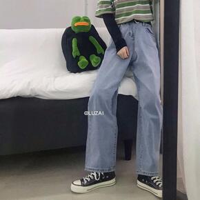 夏季港风帅气男友风磨白浅蓝色高腰牛仔阔腿裤女宽松B...