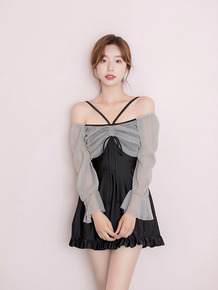 长袖泳衣女时尚新款连体保守裙式显瘦遮肚性感露背小胸...
