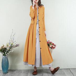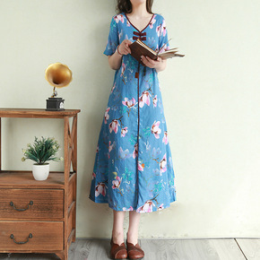 复古民族风印花棉料连衣裙夏季超长款文艺盘扣气质长裙...