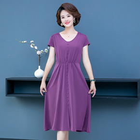 中年妈妈装v领连衣裙女夏季新款大码纯色洋气收腰短袖...