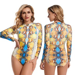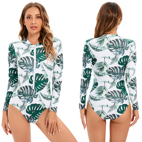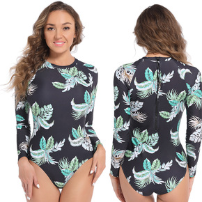 外贸连体拉链泳衣女运动长袖泳衣印花防晒冲浪服水母衣...