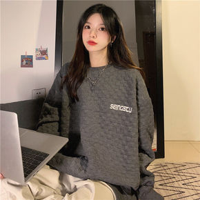 爆款灰色华夫格圆领卫衣女春秋季2021新款韩版宽松...