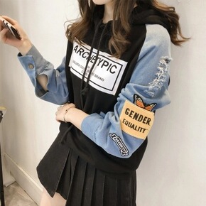 现货卫衣女韩版潮学生新款2016秋季宽松破洞牛仔长...