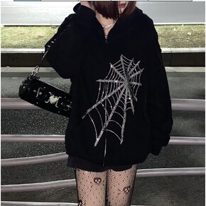 2021秋冬欧美休闲宽松外套上衣蜘蛛烫钻印花长袖加...