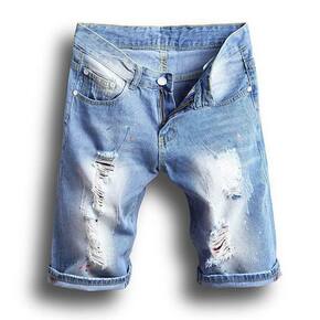 亚马逊热款欧美男式破洞牛仔短裤泼墨猫须磨白小直筒修...
