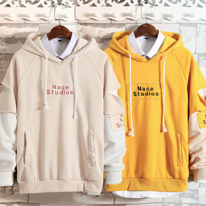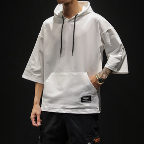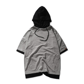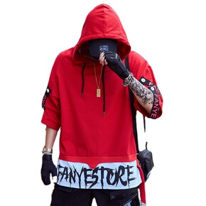 高街嘻哈卫衣男潮牌宽松假两件短袖街舞连帽字母夏季薄...